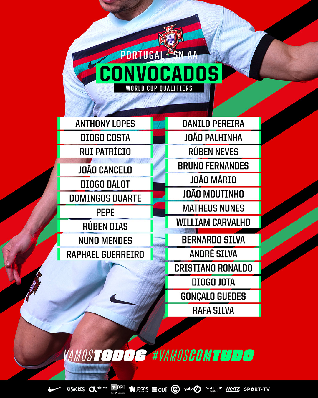 Convocados: Guarda-redes – Anthony Lopes (Olympique Lyon), Diogo Costa (FC Porto) e Rui Patrício (AS Roma); Defesas – João Cancelo (Man City), Diogo Dalot (Man United), Domingos Duarte (Granada), Pepe (FC Porto), Rúben Dias (Man City), Nuno Mendes (PSG) e Raphael Guerreiro (Borussia Dortmund); Médios – Danilo Pereira (PSG), João Palhinha (Sporting), Matheus Nunes (Sporting CP), William Carvalho (Real Betis), Rúben Neves (Wolverhampton), Bruno Fernandes (Man United), João Mário (Benfica) e João Moutinho (Wolverhampton); Avançados – Bernardo Silva (Man City), André Silva (RB Leipzig), Cristiano Ronaldo (Man United), Diogo Jota (Liverpool), Gonçalo Guedes (Valencia CF) e Rafa Silva (Benfica).
