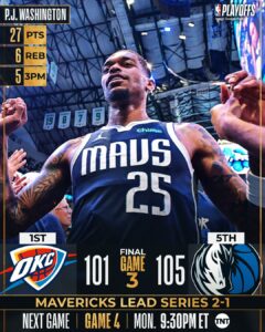 Os Mavericks assumiram a liderança da série (2-1) ao baterem os Thunder, por 105-101. Num duelo muito intenso voltou a emergir P. J. Washington, que somou 27 pontos. Já Doncic e Irving conseguiram 22 cada um. Em OKC o inevitável Shai Gilgeous-Alexander chegou aos 35, mas a equipa, nem recorrendo ao Hack-A-Lively, conseguiu contrariar o ímpeto dos anfitriões. No outro jogo da noite, os Celtics também fizeram o 2-1 com uma vitória em Cleveland, por 106-93. Tatum (33 pontos) e Brown (28) desequilibraram a balança, de pouco valendo aos Cavs os 33 pontos de Mitchell.