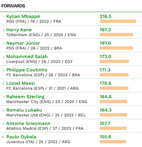 Segundo um estudo realizado pelo observatório do futebol CIES, Kylian Mbappé é o avançado e o joagdor mais caro do Mundo neste momento. O avançado do PSG, que ainda só tem 19 anos, está avaliado em €216,5 milhões, superando Harry Kane (197,3 ME) e Neymar (197 ME). Messi figura apenas no 6.º lugar, já Ronaldo pelo segundo ano consecutivo ficou de fora do Top 10 apesar de ter protagonizado uma transferência de 100 ME no último Defeso. O observatório de futebol, que só indicou jogadores das 5 principais ligas europeias, teve como critérios a idade, posição, situação contratual e rendimento. Top 10 dos avançados mais caros: