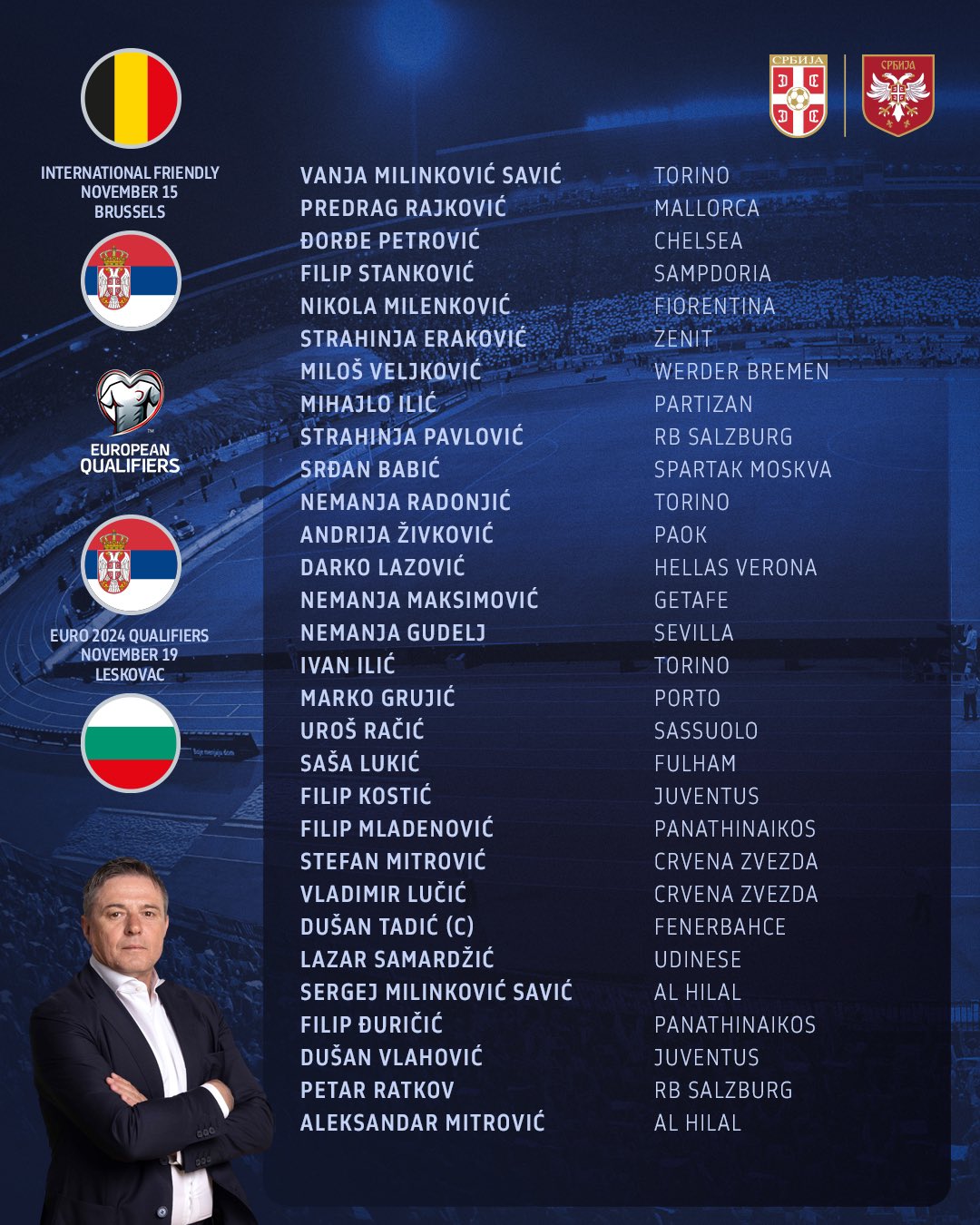 Marko Grujic integra os convocados da Sérvia para os compromissos com Bélgica e Bulgária, sendo que o duelo frente aos belgas terá caráter particular. O ex-Liverpool não tem sido titular no FC Porto, mas merece a confiança do selecionador, numa lista que tem como estreantes a dupla Vladimir Lucic, do Estrela Vermelha e Filip Stankovic, da Sampdoria. Já os craques Dusan Tadic, Sergej Milinkovic-Savic, Mitrovic, Milenkovic, Samardzic ou Vlahovic também marcam presença, assim como o ex-Benfica Radonjic e o ex-Famalicão Uros Racic.