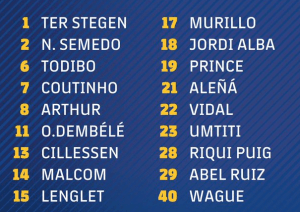 Cilessen, Semedo, Todibo, Umtiti, Alba, Puig, Vidal, Alena, Malcom, Dembelé e Boateng.