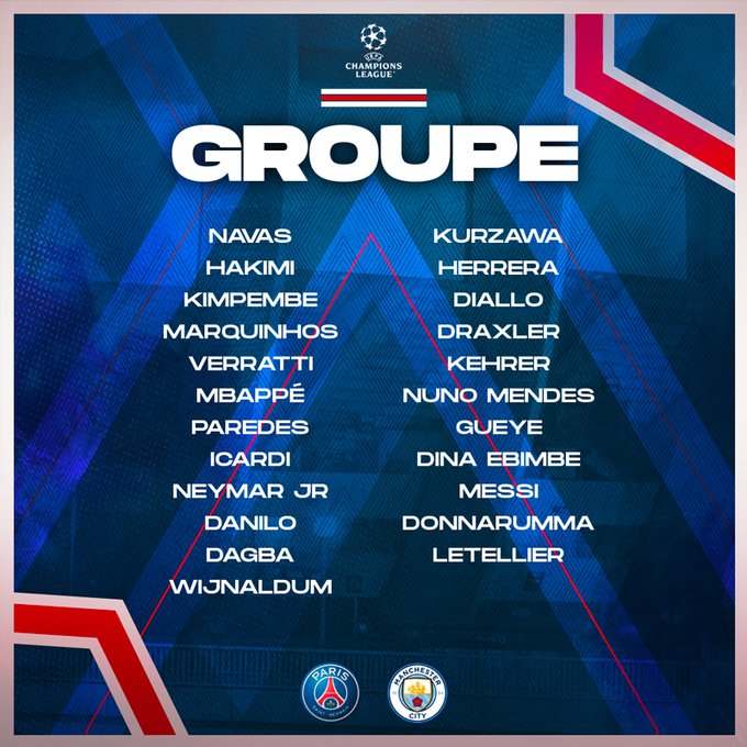 Lionel Messi, que falhou os últimos jogos por lesão, integra a convocatória do PSG para o duelo com o Man City. Também Marco Verratti está de regresso às opções de Pochettino, sendo que a lista conta igualmente com os internacionais portugueses Nuno Mendes e Danilo Pereira.