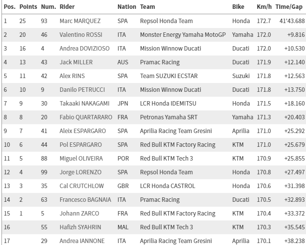 Grande prova do Miguel. Segundo melhor rookie e acabou perto dos irmãos Espargaro, ficando à frente de Lorenzo, um ex-campeão do mundo três vezes com uma moto muito superior.
