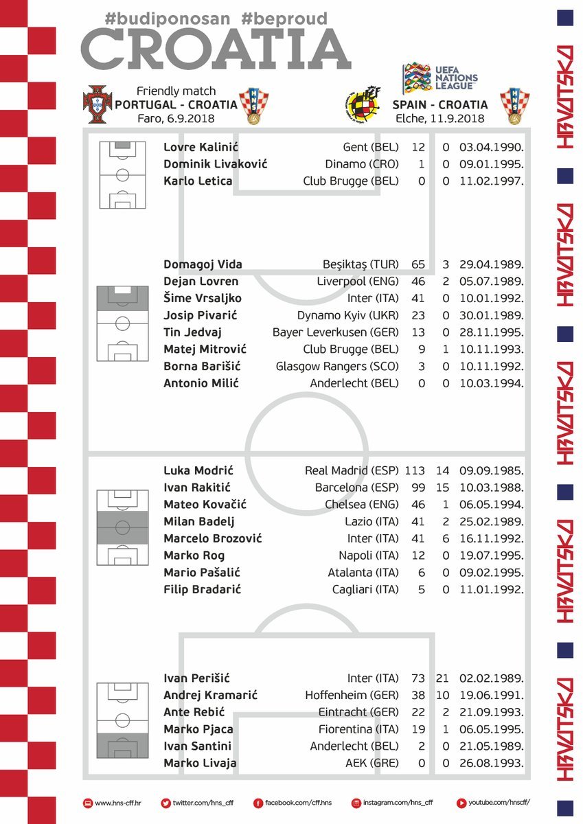 A Croácia, actual vice-campeã do Mundo, divulgou os convocados para o amigável frente a Portugal e duelo com a Espanha a contar para a Liga das Nações. Destaque para a presença de Modric, eleito o MVP do Mundial, bem como de Perisic ou Rakitic. Convocados: