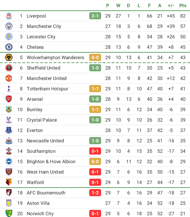Boa jornada para nós. Em relação a quem estava a nossa frente ganhamos pontos a tott e wolves e a verdade é que mesmo numa época miserável só Liverpool tem menos derrotas q nos sendo que podemos perfeitamente chegar ao top5. Temos um jogo a menos mas é contra o City o que não dá a melhor das esperanças mas veremos pq eles têm de se preocupar com champions. Está tudo longe de estar decidido, até o Leicester acredito que perca o comboio do top 3 na recta final. De resto continua a boa saga do “treinador que mais pontos conquistou desde q chegou a Inglaterra”