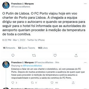 Francisco J. Marques condenou o facto de ter sido pedida a medição de temperatura à comitiva do FC Porto que chegou hoje a Lisboa através de um voo charter. “O Putin de Lisboa. O FC Porto viajou hoje em voo charter do Porto para Lisboa. À chegada, a equipa dirigiu-se para o autocarro e quando se preparava para seguir para o hotel foi informada que as autoridades do aeroporto queriam proceder à medição da temperatura de toda a comitiva. Estamos a falar de um voo charter e doméstico, só com pessoas do FC Porto. Depois de muitos protestos e perante a ausência de quem quer que fosse para proceder à medição da temperatura, a polícia assumiu a responsabilidade e permitiu a saída da comitiva do FC Porto. A equipa já está no hotel e não são estas patetices de um qualquer Putin lisboeta que vão afetar a equipa. O objetivo para amanhã é o de sempre, manter a chama de 40 anos disto, com muitas vitórias, muitas conquistas e muito orgulho no FC Porto”, pode ler-se em publicações feitas no Twitter pelo diretor de comunicação dos azuis e brancos.