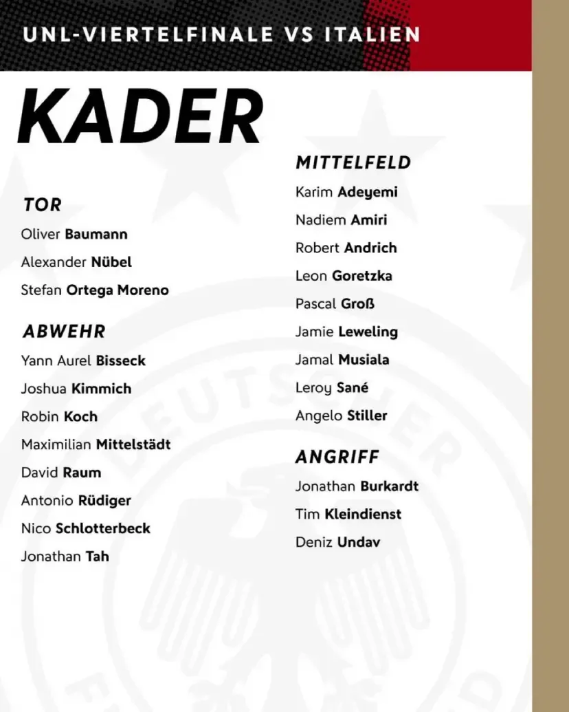 A estreia de Yann Bisseck é o grande destaque na convocatória da Alemanha para o duelo com a Itália, referente aos quartos-de-final da Liga das Nações. Recorde-se que o central do Inter representou o Vitória SC, mas saiu sem se estrear pela equipa principal. Já Leon Goretzka e Karim Adeyemi, que não eram chamados há mais de um ano, estão de regresso, enquanto Wirtz é baixa.