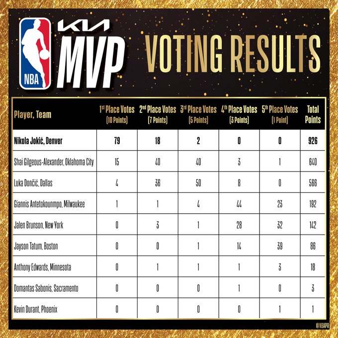 Nikola Jokić foi eleito o MVP da época regular da NBA pela 3.ª vez nos últimos 4 anos. O Center dos Nuggets recolheu 926 pontos, tendo superado Shai Gilgeous-Alexander e Luka Doncic. Jokić é assim o 9.º jogador na história a arrebatar o prémio por 3 vezes, depois de Kareem Abdul-Jabbar (6), Michael Jordan (5), Bill Russell (5), Wilt Chamberlain (4), LeBron James (4), Larry Bird (3), Magic Johnson (3) e Moses Malone (3).