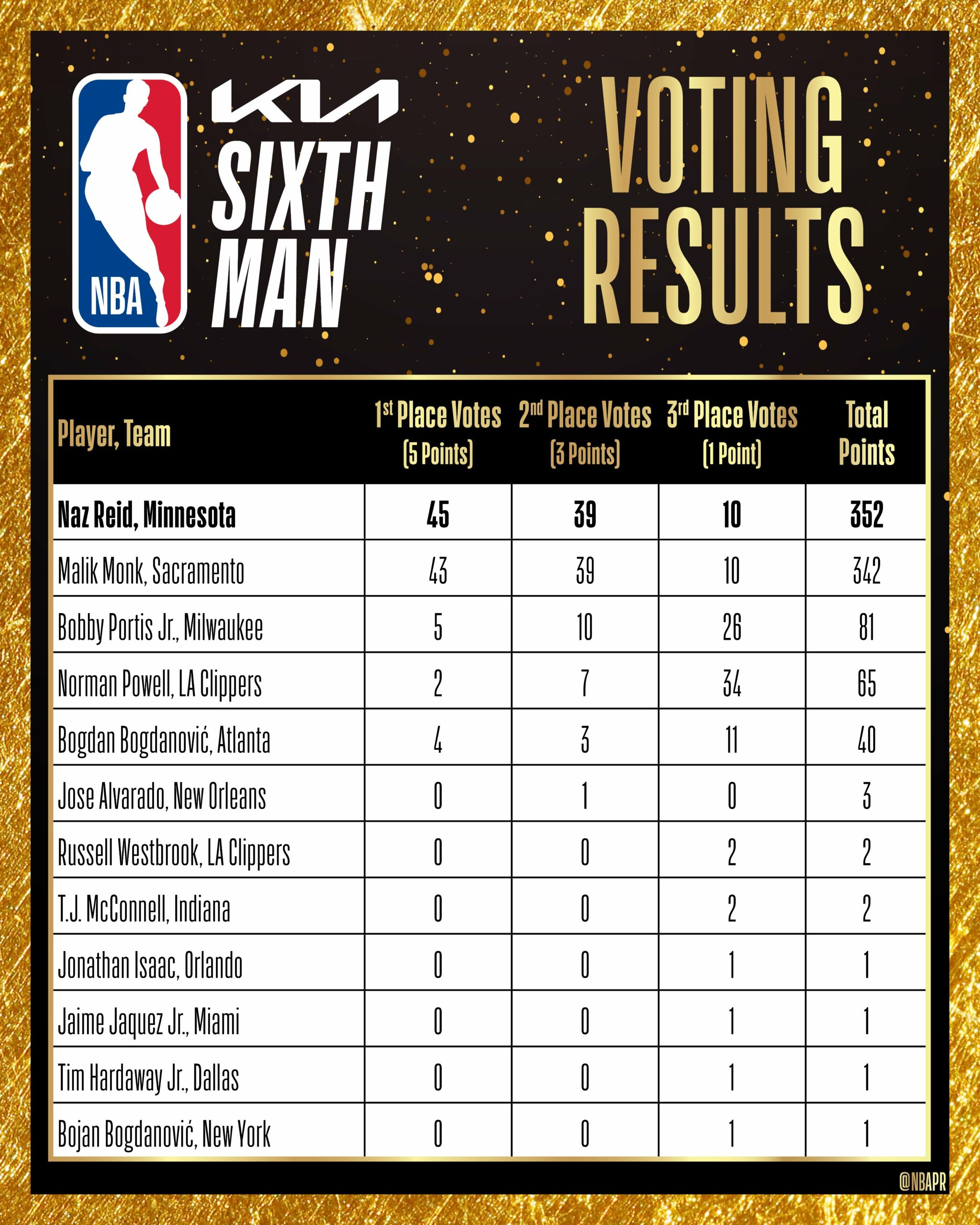 Naz Reid foi eleito o 6.º homem do Ano, prémio da NBA que destaca o melhor suplente. O Center dos Wolves teve 352 pontos, superando por apenas 10 Malik Mont, dos Kings, que era o principal favorito. Norman Powell, que também teve impacto em muitos jogos vindo do banco, ficou apenas em 4.º, com 65 pontos.