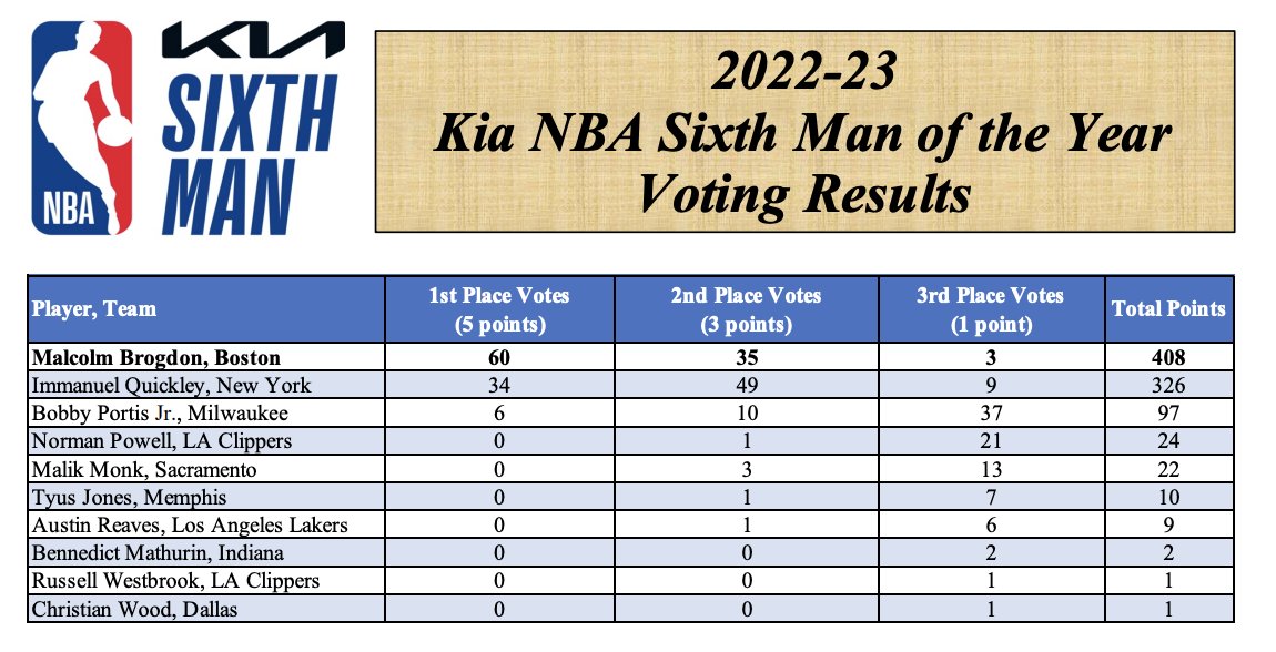 Malcolm Brogdon foi eleito o melhor 6.º homem da época da NBA. O base dos Celtics, que já recebeu o prémio de melhor rookie em 2017, superou a concorrência de Immanuel Quickley, dos Knicks, e de Bobby Portis, dos Bucks.