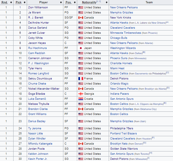 Num Draft da NBA sem grandes surpresas, os Pelicans escolheram Zion Williamson em 1.º lugar, Ja Morant foi seleccionado pelos Memphis Grizzlies, enquanto RJ Barrett saiu em 3.º para os Knicks. Atlanta, por sua vez, fez uma troca para ficar com a 4.ª escolha, tendo escolhido De’Andre Hunter. A primeira semi-surpresa surgiu na 11.ª escolha com os Suns a nomearem Cameron Johnson, quando muitos analistas pensavam que só ia sair na 2.ª ronda. Também os Magic, em 16.º, surpreenderam ao nomear Chuma Okeke, que tem perfil para ser o ‘steal do Draft’, mas que deve ficar parado um ano.