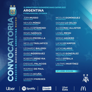 Scaloni divulgou a lista de convocados de jogadores que actuam fora da Argentina para os compromissos inaugurais da Albiceleste na fase de apuramento para o Mundial 2022. O central do Famalicão Nehuén Pérez, Acuña e Renzo Saravia estão entre os eleitos, sendo que o primeiro adversário será o Equador, em casa, seguido da Bolívia, em La Paz. Lista de convocados: Guarda-redes: Juan Musso (Udinese, Itália); Defesas: Nehuén Pérez (Famalicão, Portugal), Nicolás Otamendi (Manchester City, Inglaterra), Renzo Saravia (Internacional, Brasil), Germán Pezzella (Fiorentina, Itália), Nicolás Tagliafico (Ajax, Holanda) e Leonardo Balerdi (Borussia Dortmund, Alemanha); Médios: Guido Rodríguez (Betis, Espanha), Roberto Pereyra (Watford, Inglaterra), Exequiel Palacios (Bayer Leverkusen, Alemanha), Rodrigo De Paul (Udinese, Itália), Marcos Acuña (Sporting, Portugal), Leandro Paredes (PSG, França), Nicolás Domínguez (Bolonha, Itália), Giovani Lo Celso (Tottenham, Inglaterra) e Alexis Mac Allister (Brighton, Inglaterra); Avançados: Lionel Messi (Barcelona, Espanha), Sergio Agüero (Manchester City, Inglaterra), Lucas Ocampos (Sevilha, Espanha), Lucas Alario (Bayer Leverkusen, Alemanha), Nicolás González (Estugarda, Alemanha), Paulo Dybala (Juventus, Itália) ) e Lautaro Martínez (Inter, Itália).