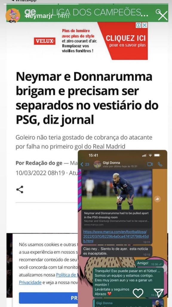 Nas últimas horas veicularam notícias de um alegado desentendimento entre Neymar e Donnarumma, no rescaldo da derrota do PSG diante do Real Madrid. O craque brasileiro veio agora a público desmentir essas notícias, mostrando inclusivamente uma troca de mensagens com o próprio Donnarumma.