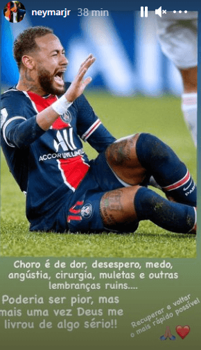 Neymar deixou o PSG-Lyon em lágrimas, depois de ter sofrida uma entrada de Thiago Mendes, e através das redes sociais explicou as razões do seu desespero. “O choro é de dor, desespero, medo, angústia, cirurgia, muletas e outras lembranças ruins. Podia ser pior, mas mais uma vez Deus livrou-me de algo sério. Recuperar e voltar o mais rápido possível”, escreveu o internacional brasileiro, que, segundo o PSG, terá sofrido ‘apenas’ uma entorse no tornozelo.