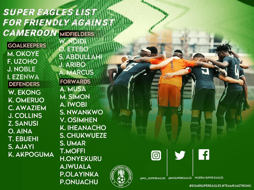 Zaidu Sanusi (FC Porto), Chidozie (Boavista) e Marcus (Feirense) foram integram a convocatória da Nigéria, para um jogo particular ante a seleção de Camarões, agendado para 4 de junho, na Áustria. Ndidi, Osimhen, Iwobi ou Iheanacho também estão na lista de Gernot Rohr.