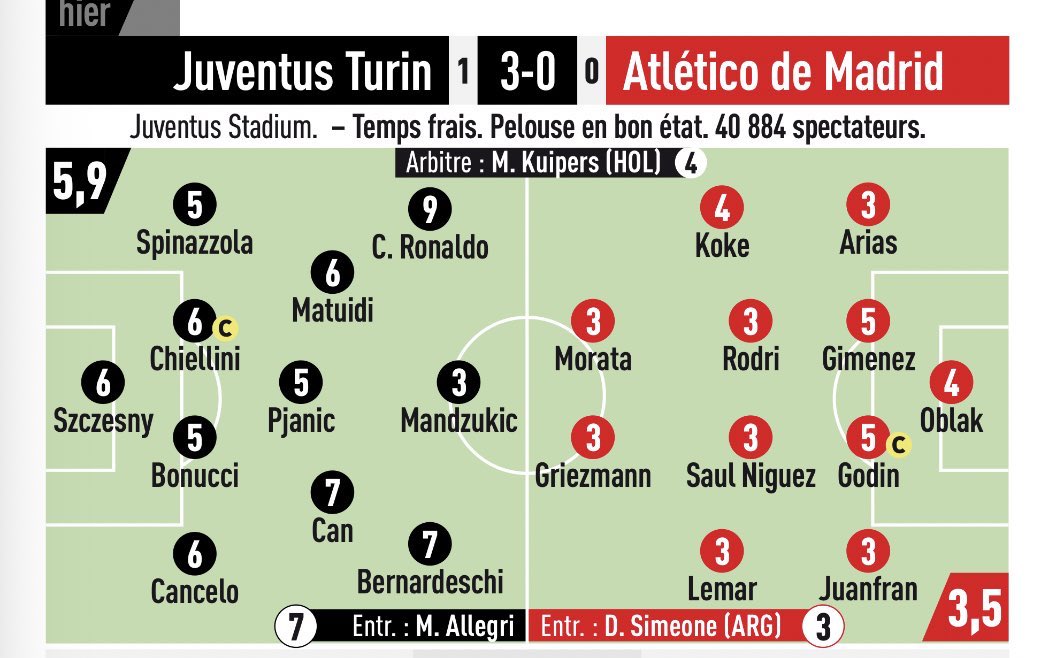 Notas estranhas do L’Equipe. Não tanto pelo Ronaldo, pois o 9 parece-me bem, mas sobretudo porque dão a mesma nota a alguns jogadores que não faz muito sentido (Can igual a Bernardeschi, Gimenez igual a Pjanic).