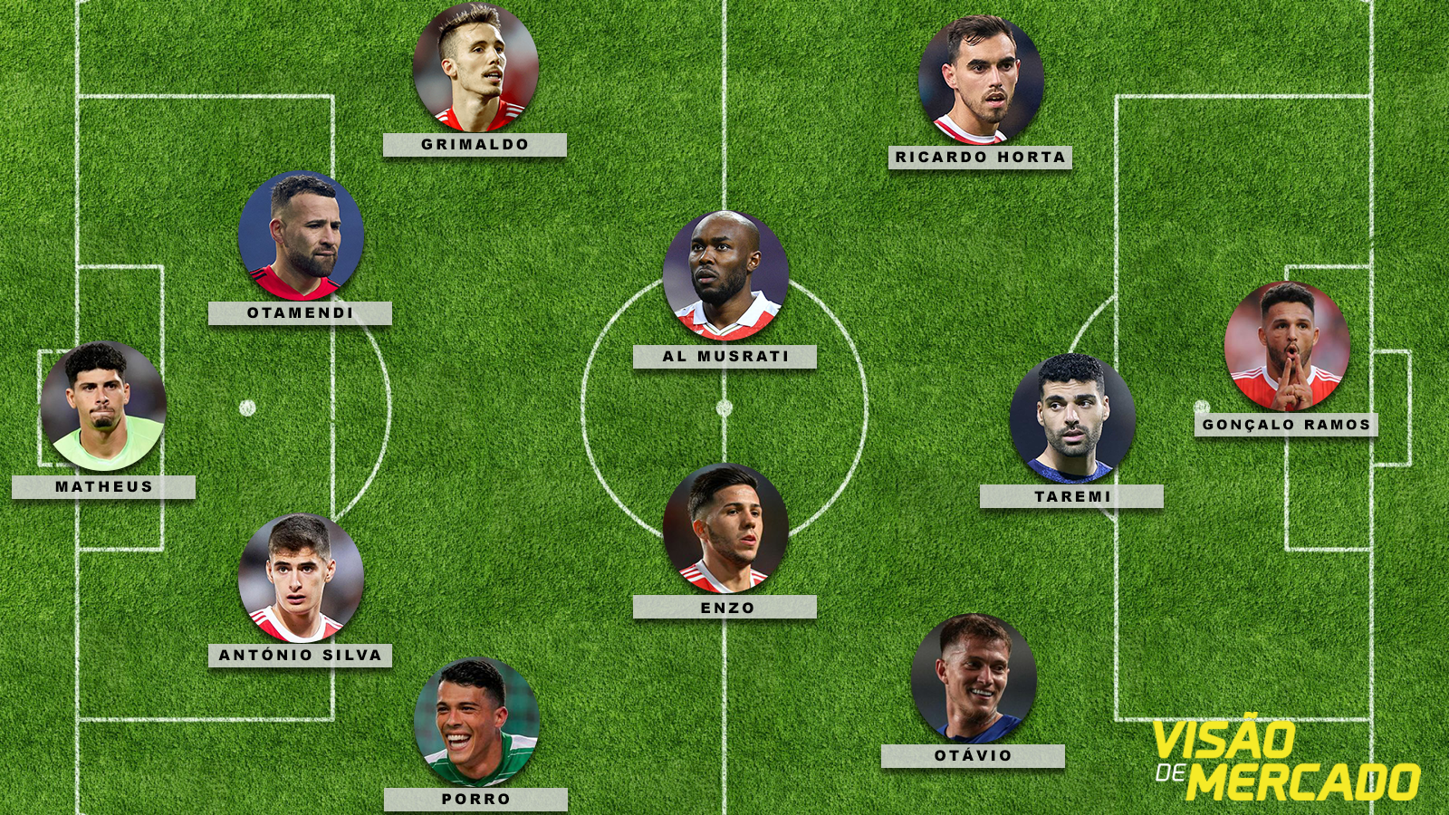 Matheus, Porro, António Silva, Otamendi, Grimaldo, Al Musrati, Enzo, Otavio, Ricardo Horta, Taremi e Gonçalo Ramos