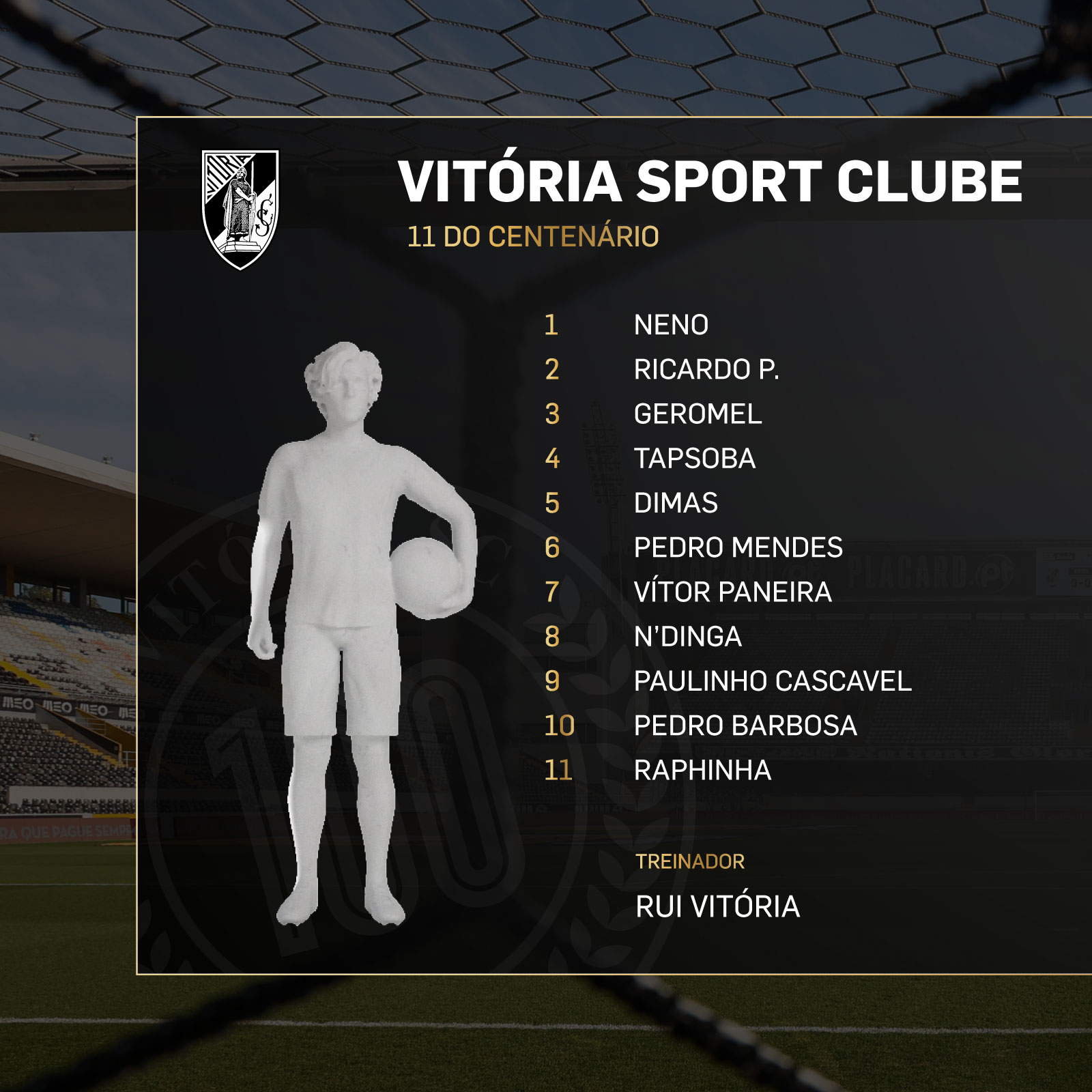 Os adeptos do Vitória SC foram desafiados a escolher o melhor onze da história do clube, no âmbito das comemorações do centenário, sendo que Neno, Ricardo Pereira, Geromel, Tapsoba, Dimas, Pedro Mendes, Vítor Paneira, N´Dinga, Paulinho Cascavel, Pedro Barbosa e Raphinha foram os mais votados. Já Rui Vitória superou Marinho Peres, Cajuda ou Manuel Machado nos treinadores.