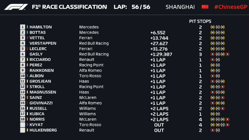 Lewis Hamilton venceu o GP 1000 na história da Fórmula 1, ao levar a melhor na China, e assumiu pela primeira vez a liderança do campeonato em 2019. O campeão do Mundo bateu logo Valtteri Bottas, que tinha conseguido a pole, na largada e controlou até ao fim. Sebastian Vettel completou o pódio, seguido por Max Verstappen e Charles Leclerc. O GP da China ficou novamente marcado por uma confusão na Ferrari, desta vez por a equipa ter dado ordens a Leclerc, que seguia em 3.º, para deixar Vettel.