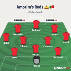 Ruben Amorim vai começar a sua Era no Man Utd frente ao Ipswich com: Onana; Mazaoui, de Ligt, Jonny Evans; Dalot Casemiro, Eriksen, Diallo; Bruno Fernandes Rashford e Garnacho..