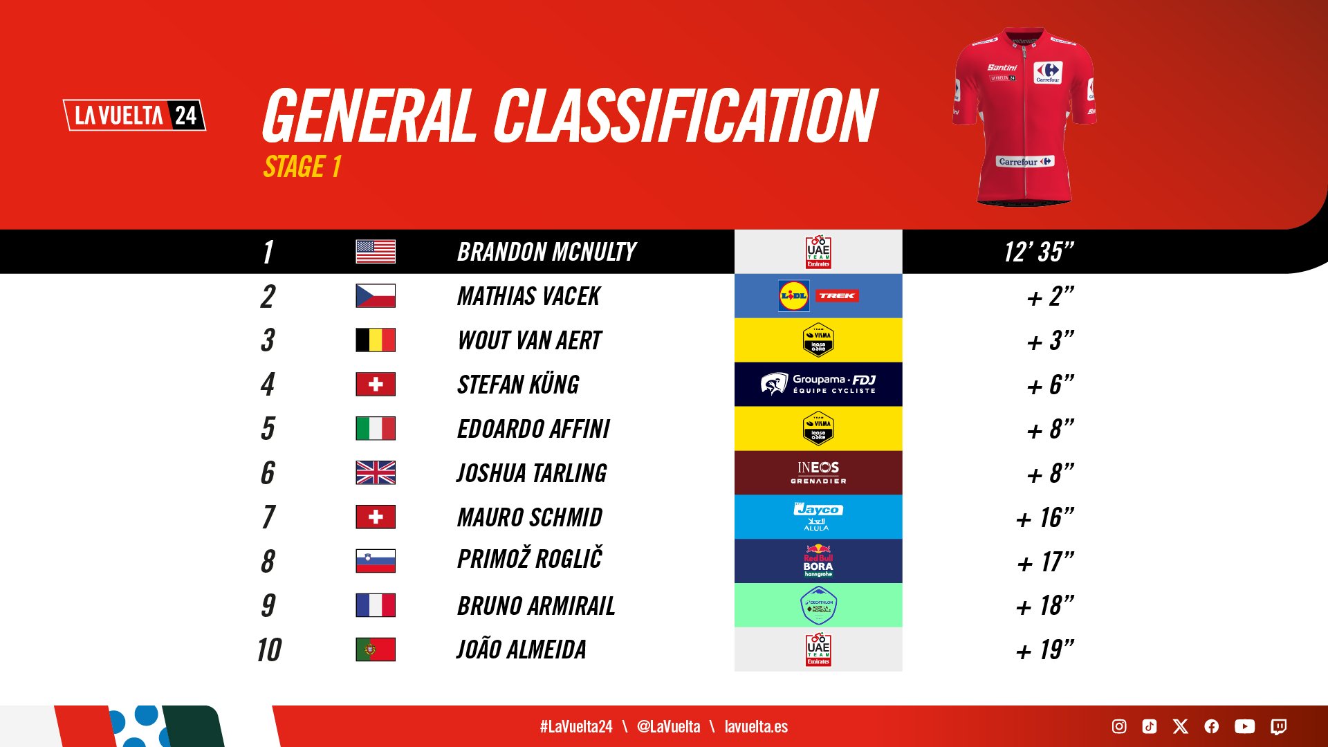 Brandon McNulty venceu a 1.ª etapa da Vuelta ao ser o mais forte no CR que se realizou entre Lisboa e Oeiras. O ciclista norte-americano, da UAE, que assume assim a liderança da prova, completou o trajeto em 12’35”, menos dois segundos que Vacek e 3 que Van Aert. Já João Almeida foi 10.º