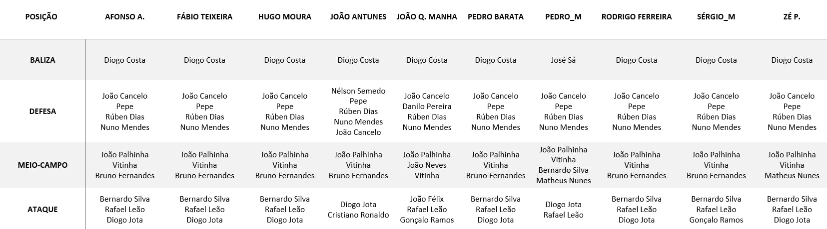 Gostava de ver o P.Neto no lugar do Bernardo para trazer mais rasgo e também de pelo menos em algum momento do jogo ver o Félix a jogar a Falso 9