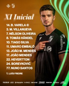 O Vitória SC vai entrar em campo na partida da Conference League frente ao Bétis com: Bruno Varela; Hevertton, Borevković, Mikel Villanueva, João M. Mendes; Tiago Silva, Händel; Umaro Embaló, João Mendes, Nuno Santos; Nélson Oliveira. Já os espanhóis vão alinhar com: Fran Vieites; Ruibal, Bartra, Natan, Perraud; Johnny Cardoso, Altimira; Antony, Isco, Jesús Rodríguez; Bakambu.