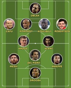 Del Piero e Drogba estão no activo? Penso estarem reformados, logo este XI é o XI com estes jogadores no auge. O CR7 no auge, que para mim foi os últimos 2 anos em Manchester mais os 2 primeiros de Madrid, não era apenas números… aliás, em termos de drible e virtuosismo era bem melhor que Mbappé, que é um jogador mais de explosão.