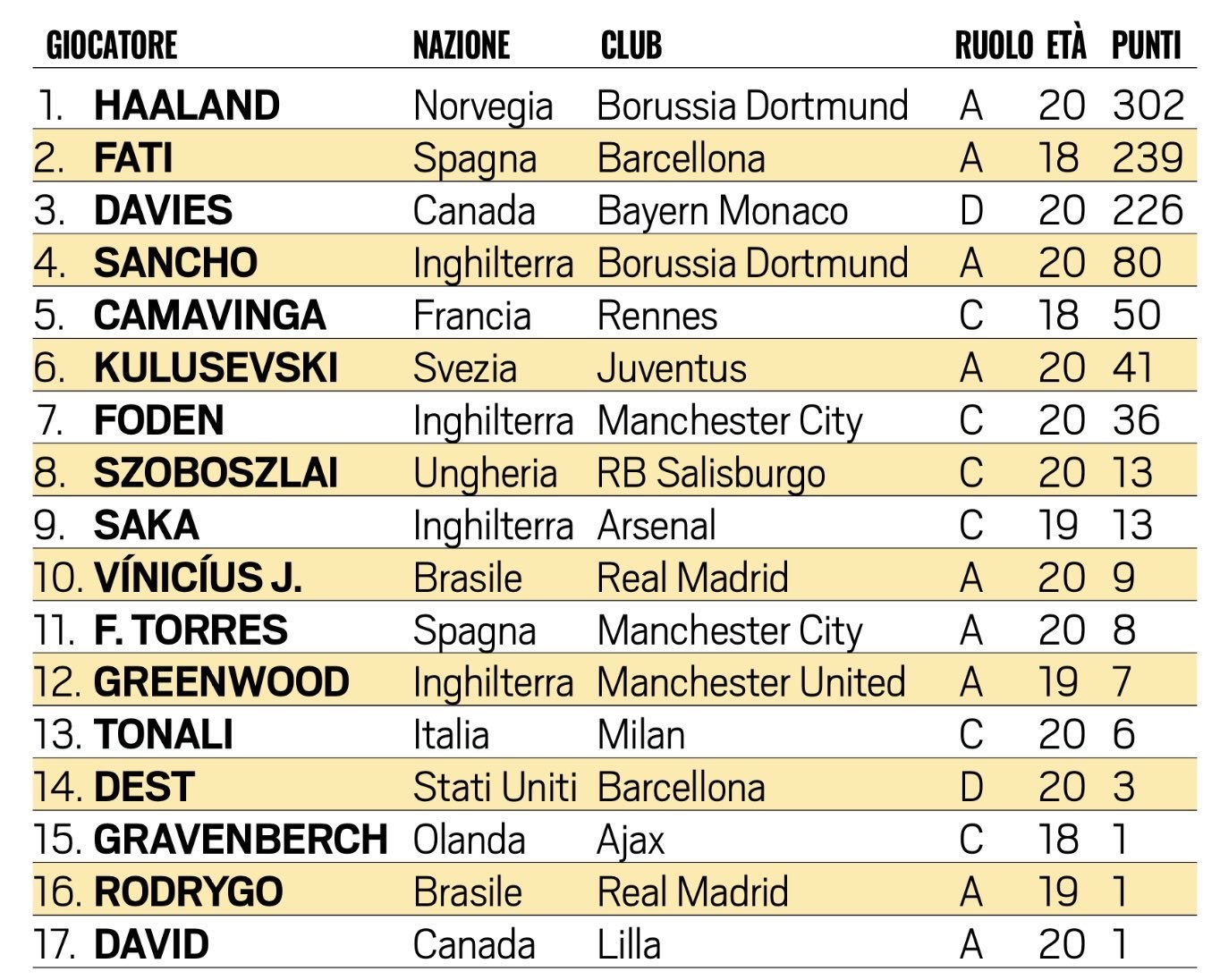 O Sancho deveria ter tido mais votos, acho injusta a posição do Fati, ainda tem tempo para lá chegar. Para mim o top-3 teria sido Haaland, Davies e Sancho por esta ordem.