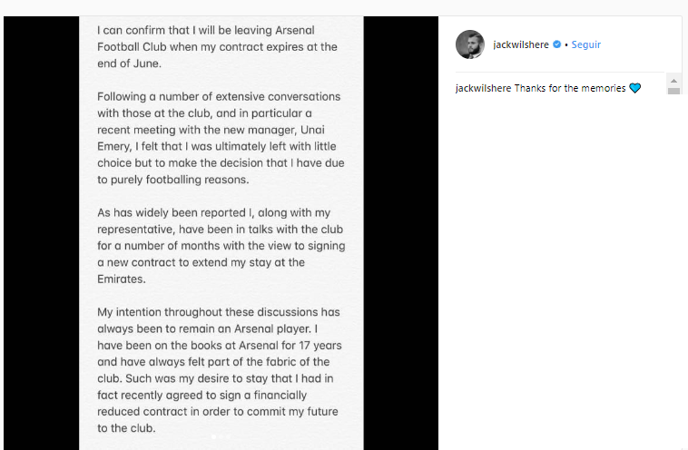Jack Wilshere anunciou, através de uma carta publicada no Instagram, que vai deixar o Arsenal no final do mês de Junho, quando termina o contrato que o liga aos Gunners. “Posso confirmar que vou deixar o Arsenal quando o meu contrato expirar no final de junho. Depois de muitas conversas com o clube [sobre a renovação] e particularmente com o novo treinador, Unai Emery, senti que me restavam poucas opções a não ser tomar esta decisão”, escreveu. O médio, internacional inglês, de 26 anos, pertencia aos quadros dos londrinos desde 2001, tendo 14 golos em 197 jogos pelo clube. Wilshere, que em 2016-17 tinha sido emprestado ao Bournemouth, na última época fez 2 golos e 7 assistências em 40 jogos.