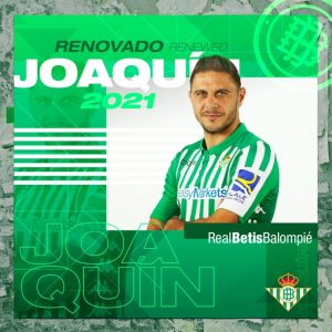 Joaquín, de 38 anos, renovou o contrato que o liga ao Bétis até 2021. O extremo, internacional espanhol, chegou aos Béticos em 1994 e, apesar de ter saído entre 2006 e 2015, já leva uma ligação de 20 anos ano clube. Esta época, mesmo com os 38 anos, soma 6 golos e 2 assistências em 17 jogos.