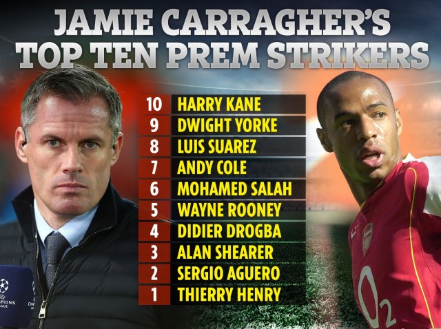Jamie Carragher fez o Ranking dos 10 melhores avançados na história da Premier League no Telegraph, tendo colocado Thierry Henry em 1.º. «É indiscutível. Surpreende-me como é que alguém poderá debater isto. Está muito acima dos outros», disse o ex-defesa sobre o francês que brilhou pelo Arsenal. A lenda do Liverpool completou o Top com Sergio Aguero, Alan Shearer, Didier Drogba, Wayne Rooney, Mo Salah, Andy Cole, Luis Suárez, Dwight Yorke e Harry Kane.