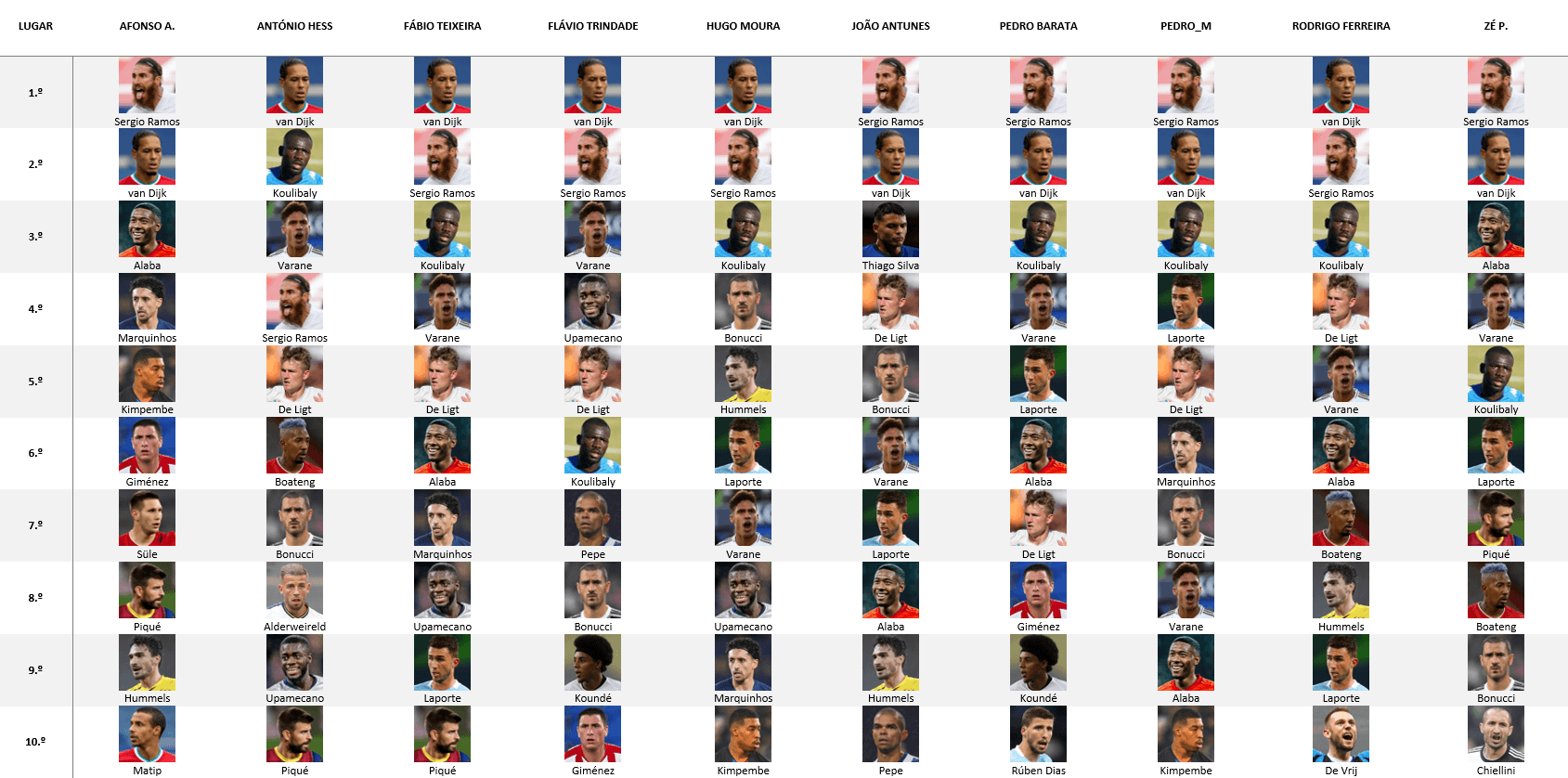 Uma lista aceitável, embora De Ligt pareça um bocado acima do seu real valor, pelo menos para já, é um jogador que aprecio e que tem tudo para ser um dos grandes centrais dos próximos anos. Também Varane está no 4º lugar porque tem já algum estatuto devido a fazer parelha com o Ramos, mas está mais que visto que quando tem de assumir o papel principal cede e compromete bastante. De referir ainda que não compreendo de todo como o Boateng tem mais votos que Pepe ou Rúben Dias (e outros claro, refiro apenas estes por serem os melhores portugueses). Mesmo Piqué já não é o de outros tempos e se por “ignorar momento de forma” significa considerar o pico da carreira (o que não faz sentido nenhum) então o Pepe estaria num top5.