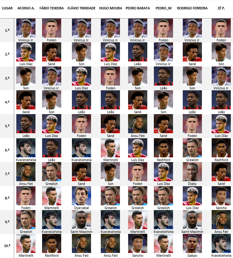 Aqui é Neymar, Mane, Vini Jr, Son, Phil Foden, Rafael Leão e Sane estes pelo menos parecem-me indiscutíveis. Depois colocaria Luís Díaz, Kvaratskhelia e Martinelli a fechar o top10. Sem ordem seria isto para mim!