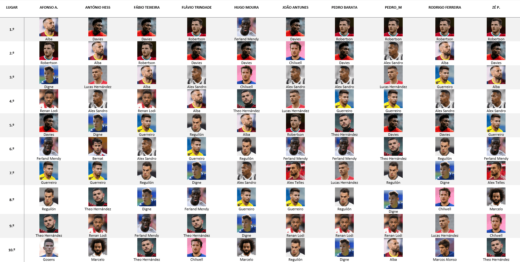 Para mim, o top será entre Alba, Alex Sandro e Robertson. Abaixo destes, Mendy, Chidwell, Theo, Lucas, Digne, Reguillon, Angelino (em grande forma), Guerreiro, Davies e Gosens (outro em grande forma).