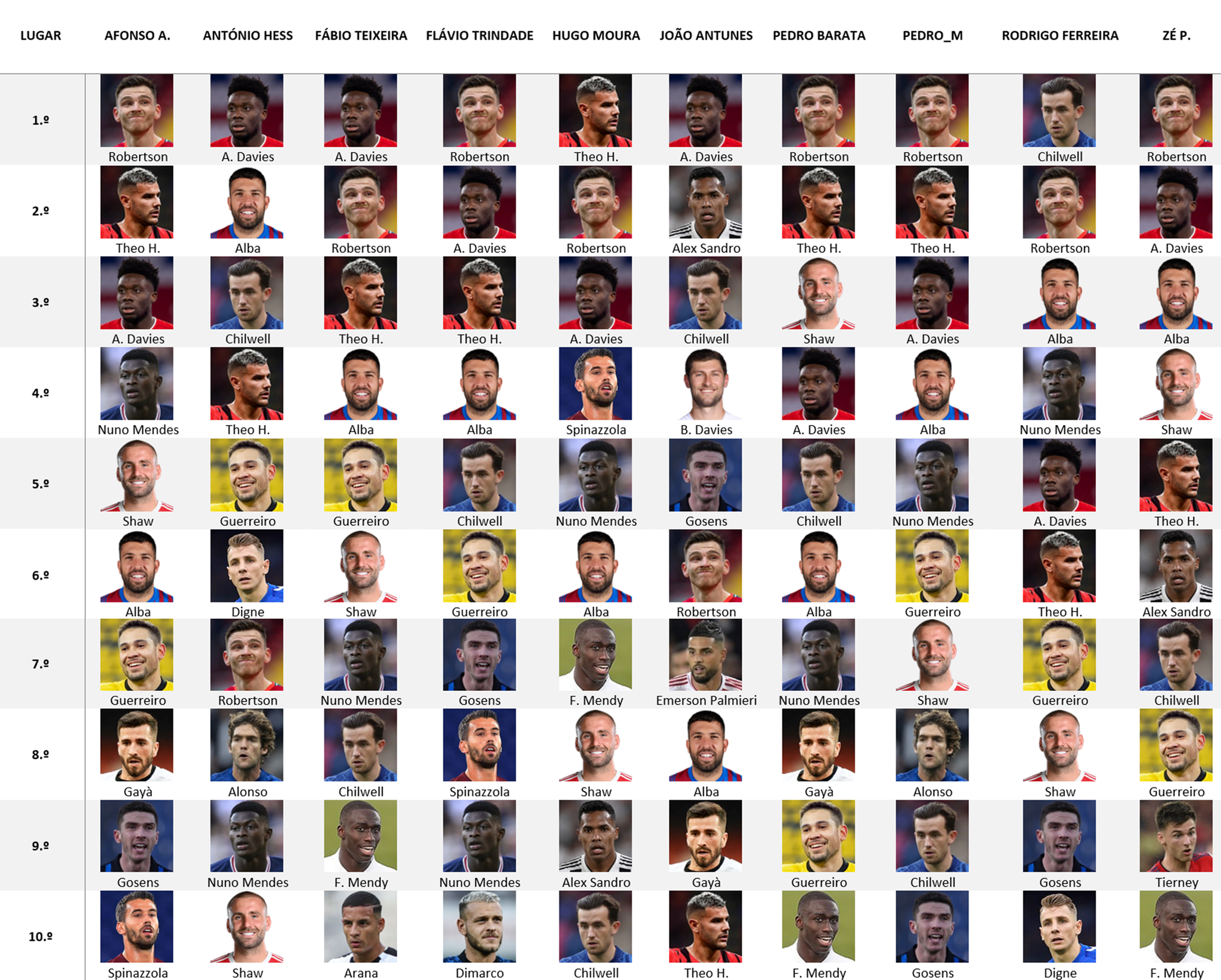 Robertson e Theo são superiores aos restantes, Al. Davies necessita evoluir a nível defensivo para chegar a este patamar. Chilwell, Alba, L. Shaw, Alex Sandro, F. Mendy, Alonso e Digne completariam o meu top10.