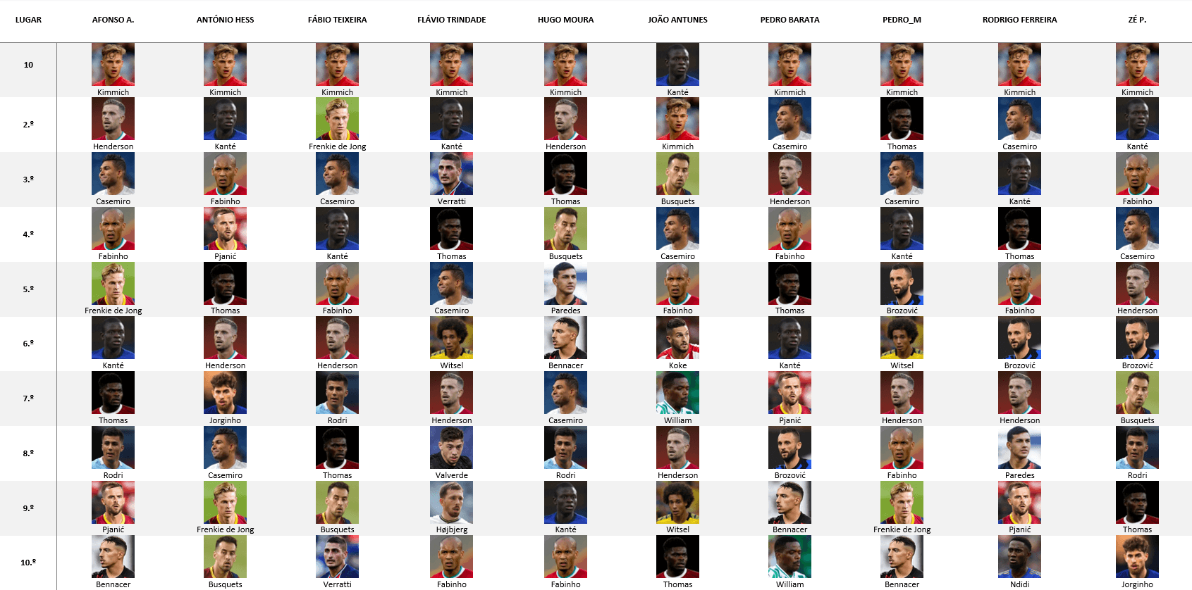 Para mim o melhor, naquilo que eu aprecio num médio defensivo, voto no Kanté! Embora eu até o veja mais como #8, não acho que seja fraco com a bola nos pés e está em todo o lado, falta-lhe golo sim mas como é tão forte na disponibilidade física, inteligência tática e capacidade na recuperação de bola acaba por ficar ofuscado no resto e desvalorizam, mas acho que ele tem qualidade com bola. Ou então Casemiro. Mas sinceramente se fosse a juntar físico, parte defensiva e construção num só iria pelo Fabinho ou Partey, talvez os mais completos. Mas Kimmich e Kanté concordo que estejam no top2 como melhores jogadores e no geral concordo com o top10. Gosto imenso de Henderson também, sem se dar por ele tem muita importância no meio-campo do Liverpool e é um jogador bastante consistente e fiável.