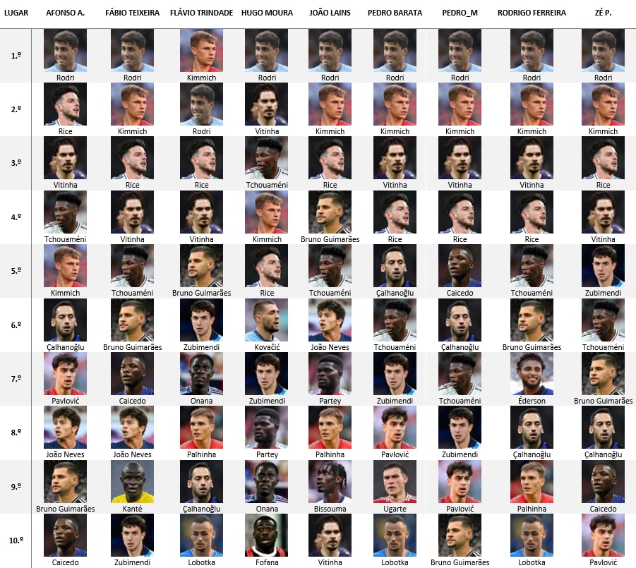 Top-3 óbvio: Rodri, Kimmich e Rice.