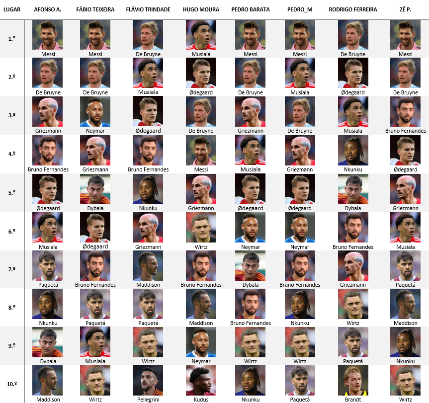 Acho que no top final, odegaard e Griezmann estarem à frente de Bruno Fernandes um bocado ambicioso .. Para mim De bruyne e Messi claramente, mas depois parece me so Musiala a conseguir igualar ..