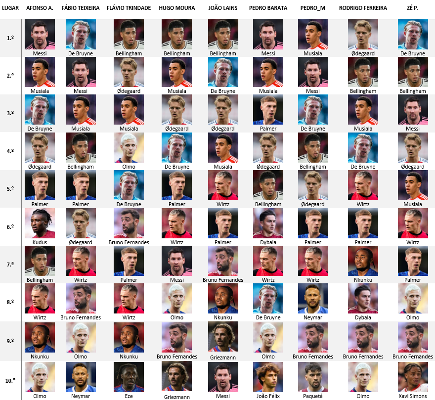Palmer deveria estar muito mais acima, e acho que podemos considerá-lo o melhor na posição. Consegue aliar jogo jogado com números, sendo que dos jogadores que aqui estão, parece-me ser o que mais influência tem na equipa. Bellingham nunca na vida poderia estar acima de Palmer. E KDB, apesar de o adorar, nesta altura também não. Para mim o top 3 seria entre Odegaard, Musiala e Palmer são top-3 e qualquer ordem seria aceitável para mim.
