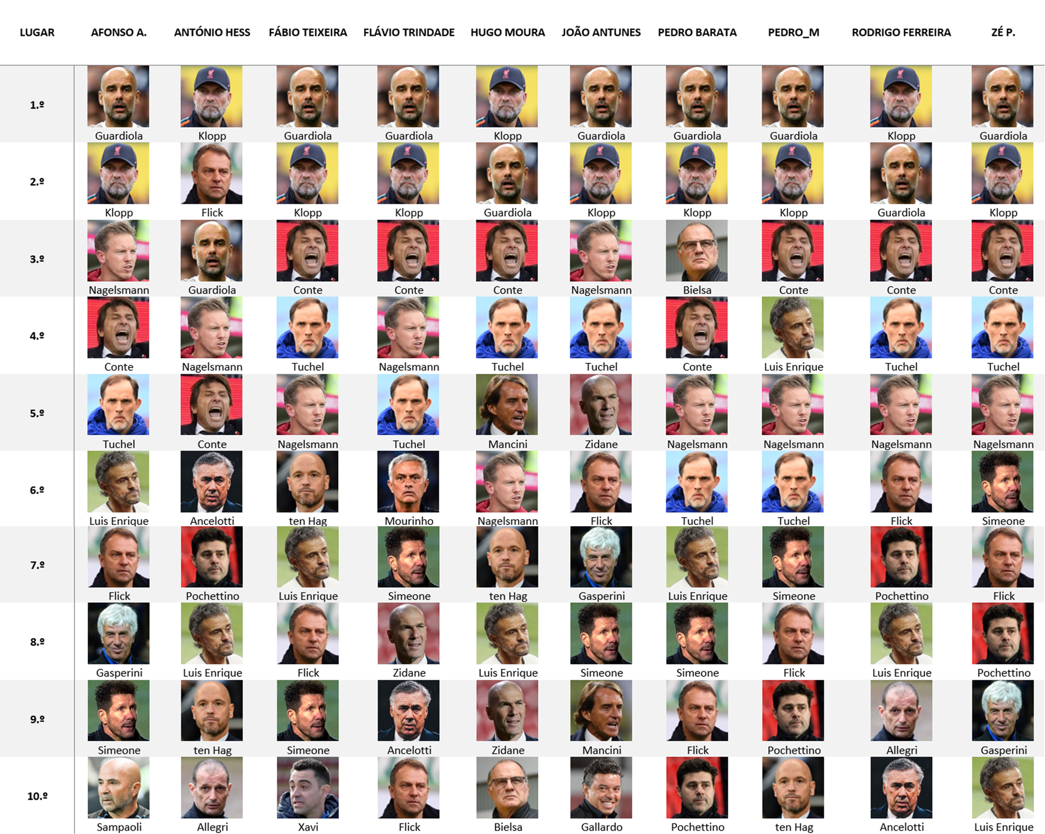 Assim o meu top 10, num mix de treinadores que metem as equipas a jogar um futebol que eu acho agradável e conseguem bons resultados: