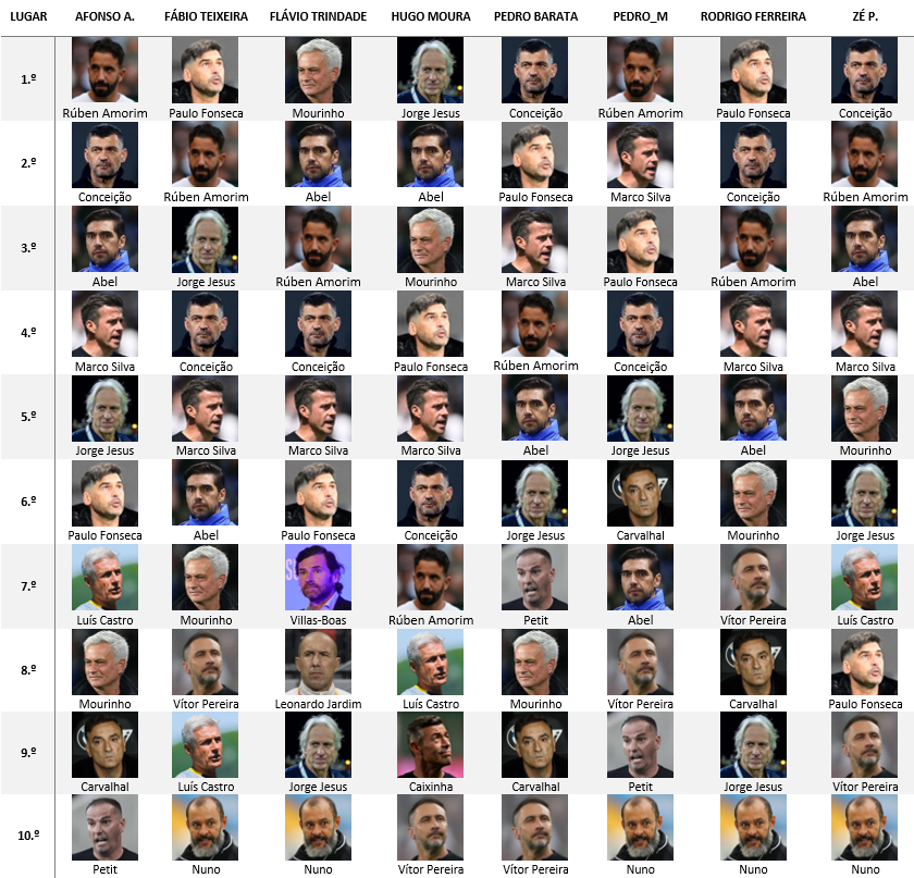 Não gosto minimamente da postura e abordagem do Abel mas tem de estar cá. Depois é mais complexo. Pode-se colocar o Artur Jorge, que faz muitos pontos com o Braga apesar de ter uma relação amor-ódio com os adeptos e a equipa passar por fases estranhas a nível de performance. O Conceição a bem ou a mal tem de lá estar num top, mas eu prefiro Amorim que tem mostrado mais.