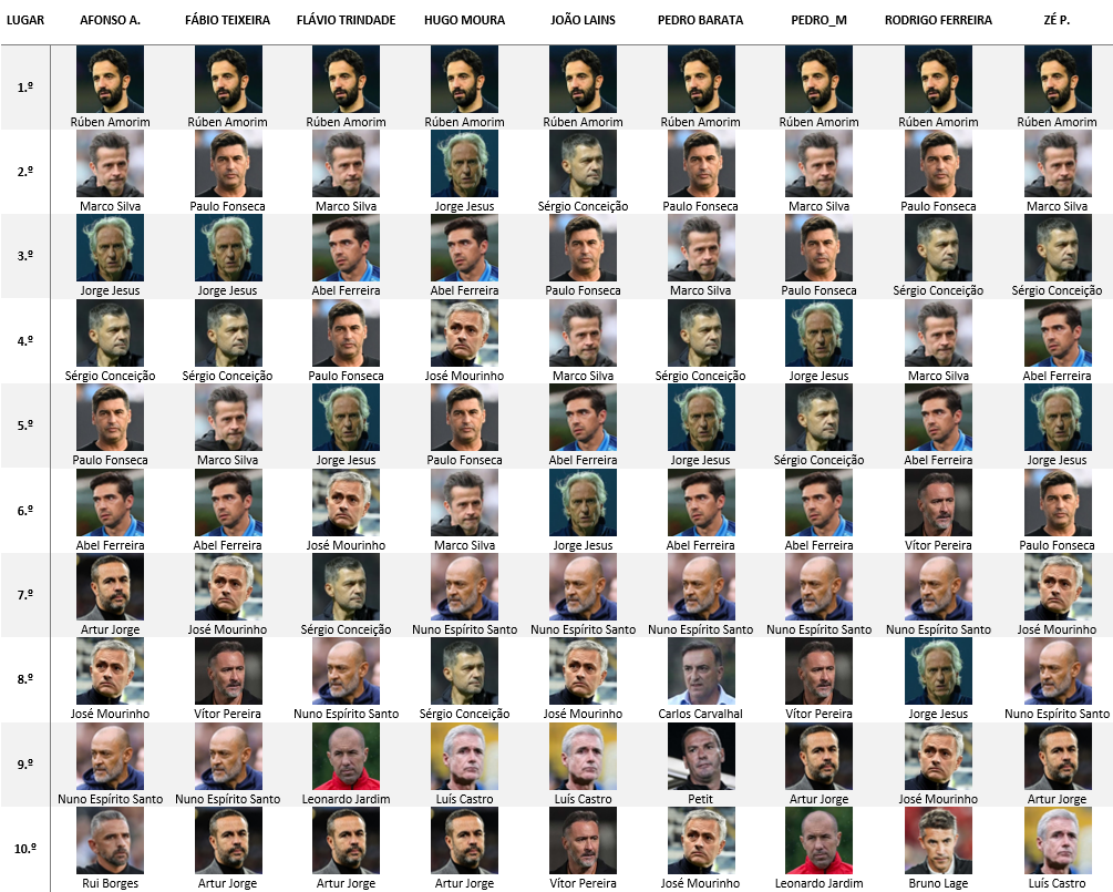 Como sportinguista e fã do Ruben, não posso deixar de assinalar o quão negativo é o confronto directo deste com o Sergio. Que me digam que o Ruben tem outras qualidades como o saber comunicar, uma ideia de jogo mais apelativa e sedimentada, tudo isso é verdade. No entanto, quer-me parecer que o futebol ainda são resultados e, por isso, para mim, o Sergio está em primeiro. Só por uma vez o Sporting do Ruben venceu o Porto do Sergio para a Liga. Sintomático! Se o Sergio é só raça, isso significa que só com uma qualidade que ele incute nas suas equipas, consegue sobrepor-se ao Amorim. Depois destes, coloco JJ em terceiro.