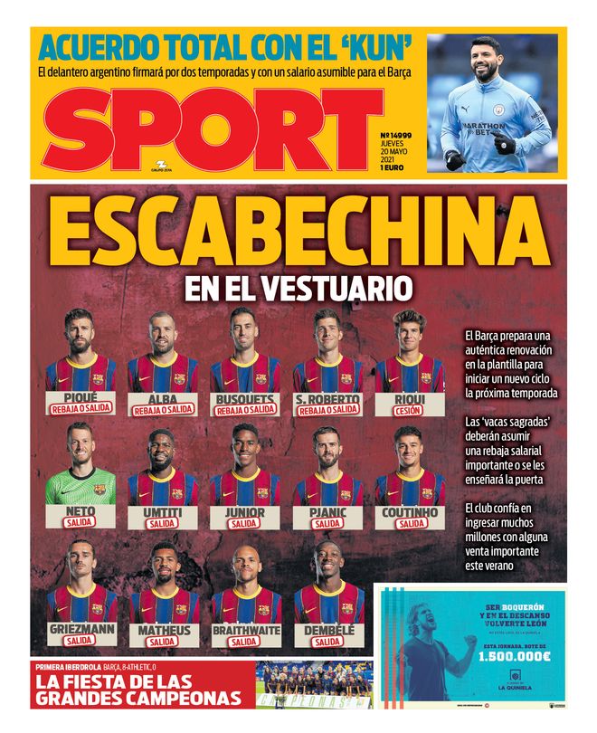 Joan Laporta anunciou que vai haver uma revolução no Barcelona e hoje o Sport nomeia os jogadores que estão na porta de saída. Segundo o diário da Catalunha, Neto, Umtiti, Junior Firpo, Pjanic, Coutinho, griezmann, Matheus, Braithwaite e Dembélé são para vencer, Riqui Puig para emprestar, enquanto os pesos pesados Piqué, Alba, Busquets e Sergi Roberto ou baixam o salário ou saem.