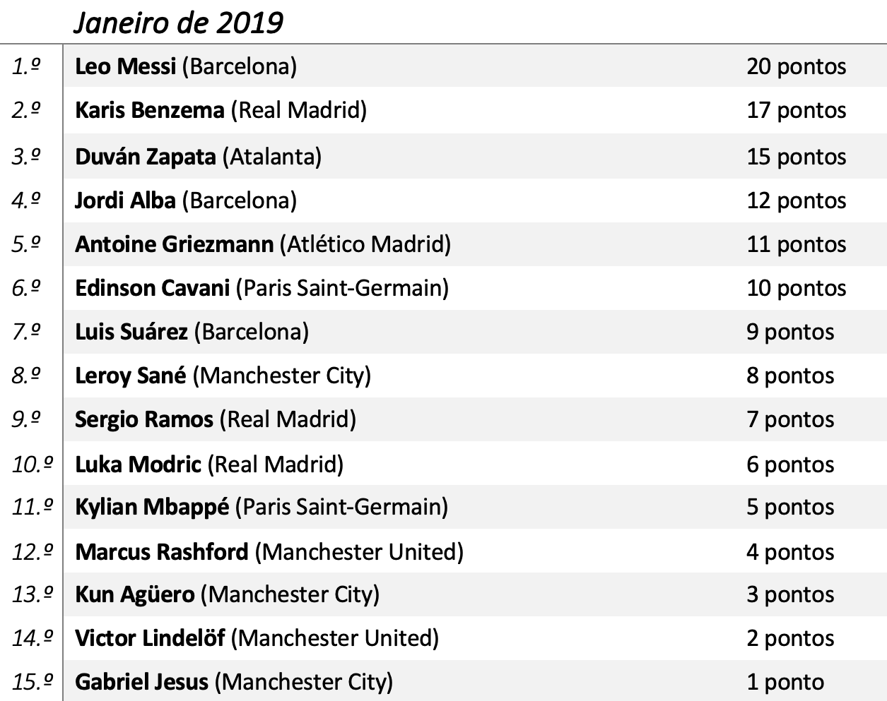 Desde que Ronaldo e Messi se erigiram como os melhores da sua geração, dividindo entre si a maioria dos galardões individuais, a “rivalidade” entre ambos transfigurou a forma como futebolistas, adeptos e o universo do futebol em geral encaram a Bola de Ouro. Nesse sentido, o Visão de Mercado irá mensalmente indicar num ranking aqueles que mais fizeram para conseguir o prémio de melhor jogador do Mundo de 2019 com critérios bem ponderados, ilustrando uma espécie de corrida entre as várias estrelas do futebol mundial. A ideia passa por atribuir uma pontuação aos jogadores que mais se destacaram nesse mês para que no final deste ano civil seja possível, de uma maneira justa, eleger aqueles que foram verdadeiramente os melhores. E como estamos em constante evolução e queremos oferecer aos leitores um método de avaliação cada vez mais justo, este ano, cada vez que um jogador repita a presença no Top, ser-lhe-á adicionado mais 4 pontos.
