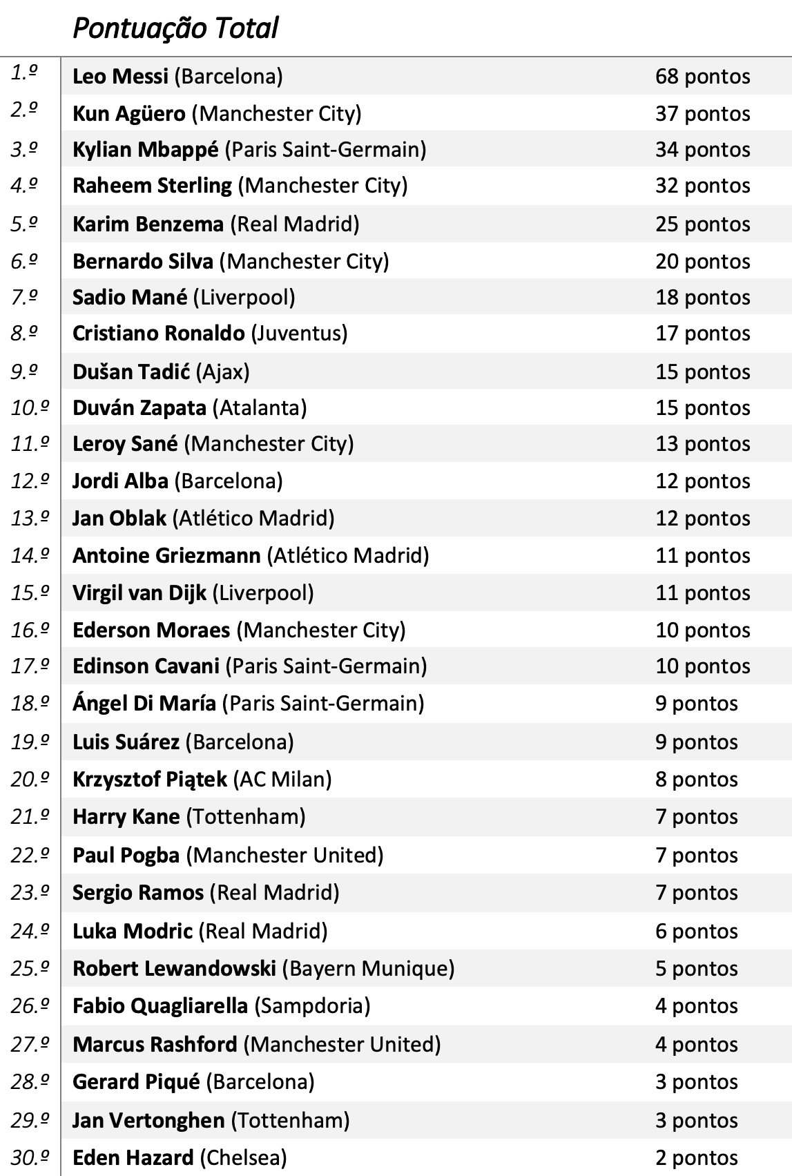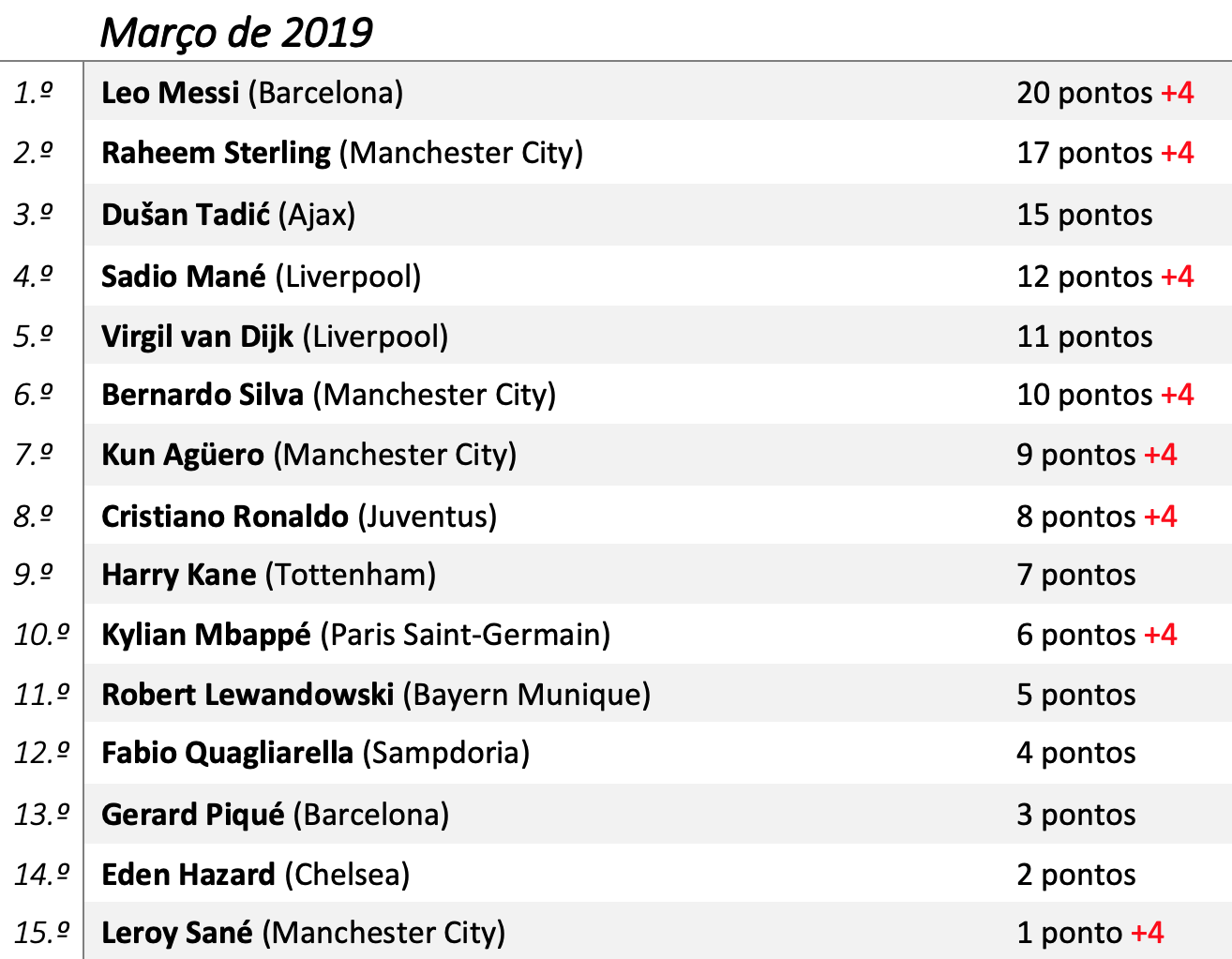 Desde que Ronaldo e Messi se erigiram como os melhores da sua geração, dividindo entre si a maioria dos galardões individuais, a “rivalidade” entre ambos transfigurou a forma como futebolistas, adeptos e o universo do futebol em geral encaram a Bola de Ouro. Nesse sentido, o Visão de Mercado irá mensalmente indicar num ranking aqueles que mais fizeram para conseguir o prémio de melhor jogador do Mundo de 2019 com critérios bem ponderados, ilustrando uma espécie de corrida entre as várias estrelas do futebol mundial. A ideia passa por atribuir uma pontuação aos jogadores que mais se destacaram nesse mês para que no final deste ano civil seja possível, de uma maneira justa, eleger aqueles que foram verdadeiramente os melhores. E como estamos em constante evolução e queremos oferecer aos leitores um método de avaliação cada vez mais justo, este ano, cada vez que um jogador repita a presença no Top, ser-lhe-á adicionado mais 4 pontos.