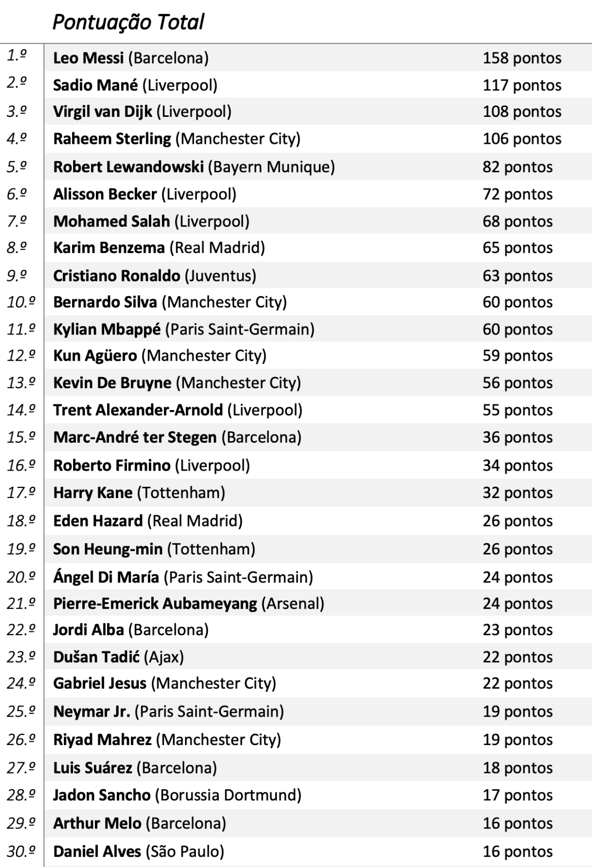 A pontuação total do Rumo à Bola de Ouro’2019: