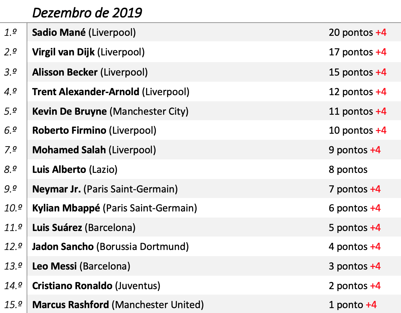 6.º Roberto Firmino (Liverpool) – Fez o golo decisivo no Mundial frente ao Monterrey e apontou o único tento da final frente ao Flamengo de Jorge Jesus. Marcou ainda mais 2 golos e fez uma assistência ao longo do mês.
