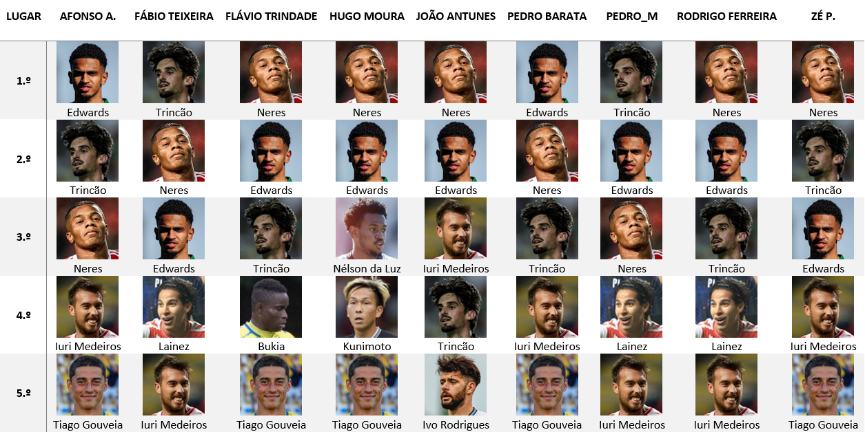 Para mim Neres é bem melhor que o Trincão mas é apenas a minha opinião, claro. Ainda assim acho que o top3 é óbvio com estes dois mais Edwards. Depois não entendo como colocam Pote a extremo esquerdo e não colocam Rafa como extremo mas depois aqui não aparece Otávio quando tem jogado imensas vezes sobre a direita e assumindo como tal para mim coloco em 1º, joga e faz jogar com alta competitividade e consistência. Em 5º depois é mais discutível mas talvez fosse por Iuri Medeiros ou Tiago Gouveia.