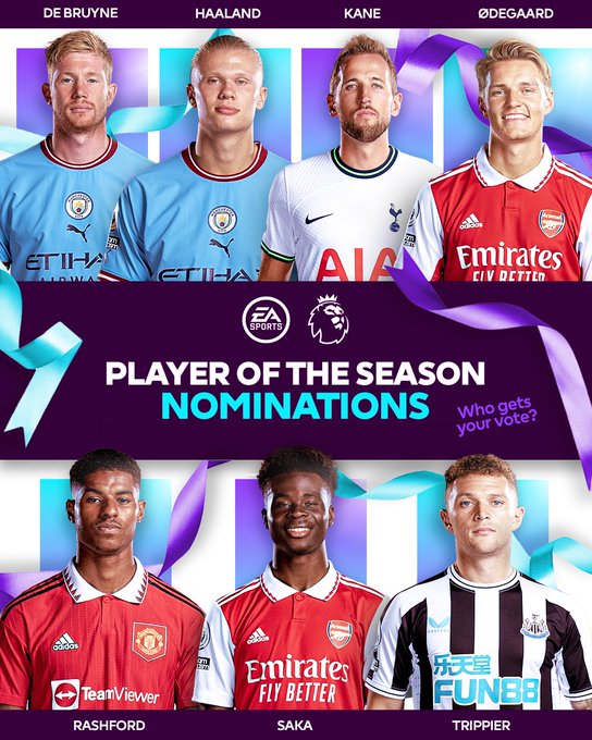 Já são conhecidos os nomeados para melhor jogador do Ano na Premier League 2022-23. O inevitável Haaland é um dos candidatos, juntamente com o companheiro do City Kevin de Bruyne. Odegaard e Saka do Arsenal também estão na lista, tal como Kane (Tottenham), Rashford (Man Utd) e Trippier (Newcastle).